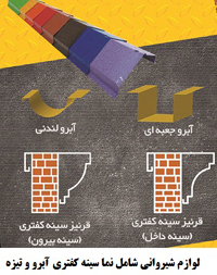 اقلام شیروانی: پشم شیشه، توری مرغی، پیچ سرمته، آچار سرمته، آبرو، تیزه، نما، فلاشینگ