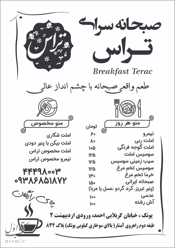 صبحانه سرای تراس با چشم اندازی عالی ،فضایی دلنشین و قیمتی مناسب همه روزه از 7 صبح پذیرای شما می باشد