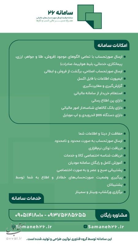 سامانه26 یا سامانه واسط مودیان پیمانکاران راهی مناسب بدون خطا و سریع برای ارسال صورتحساب ها و جلوگیری از جریمه شدن شما. اموزش وپشتیبانی تخصصی رایگان.- آموزش حسابداری و حسابرسی