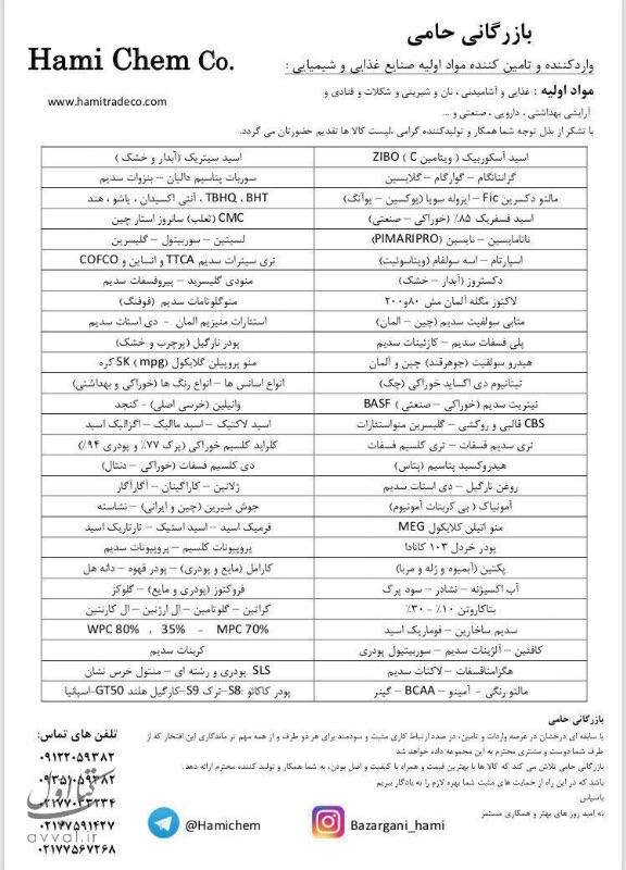 با بیش از چندین سال سابقه درخشان با مدیریت علمی و عملی در عرصه واردات و فروش مواد اولیه صنایع غذایی و خوراکی و مواد شیمیایی صنعتی با کیفیت تضمین شده بهترین برندهای معتبر جهانی در خدمت شما تولید کنندگان محترم
