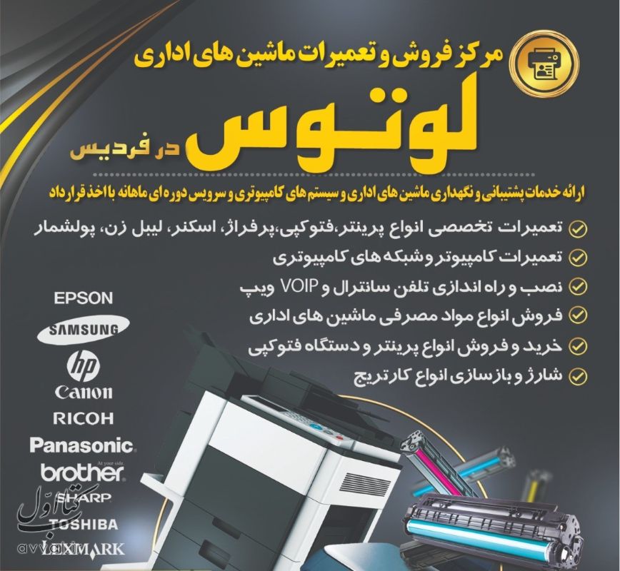 تنها نماینده رسمی ماشین های اداری لوتوس در فردیس تعمیرات تخصصی انواع پرینتر ، فتوکپی ، پرفراژ، اسکنر ،لیبل زن ، فیش پرینتر ، پولشمار خرید و فروش- پرینتر