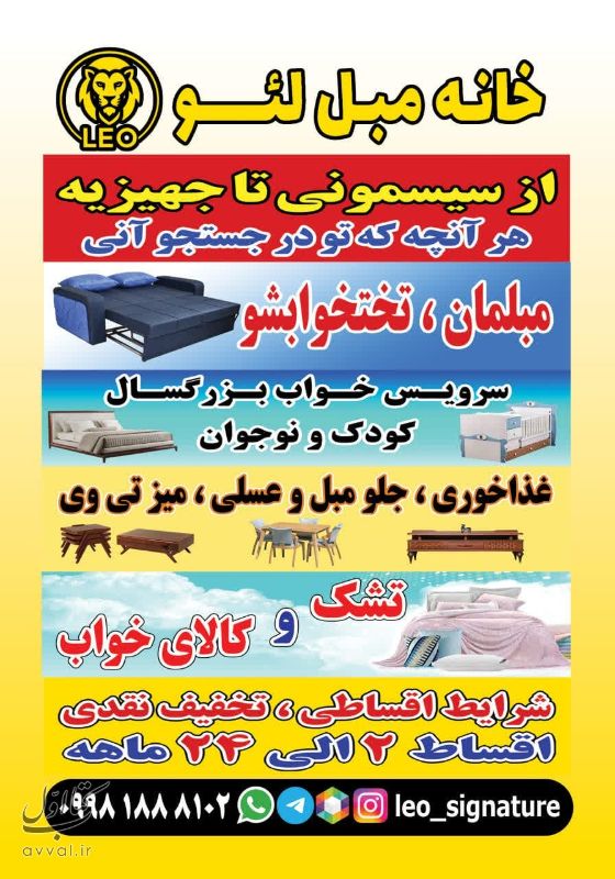 خانه مبل لئو(خوش سیرت) از سیسمونی تا جهیزیه هر آنچه که تو در جستجوی آنی مبلمان غذاخوری مبل تختخوابشو سرویس خواب بزرگسال،کودک و نوجوان تش- فروش تشک لحاف و بالش