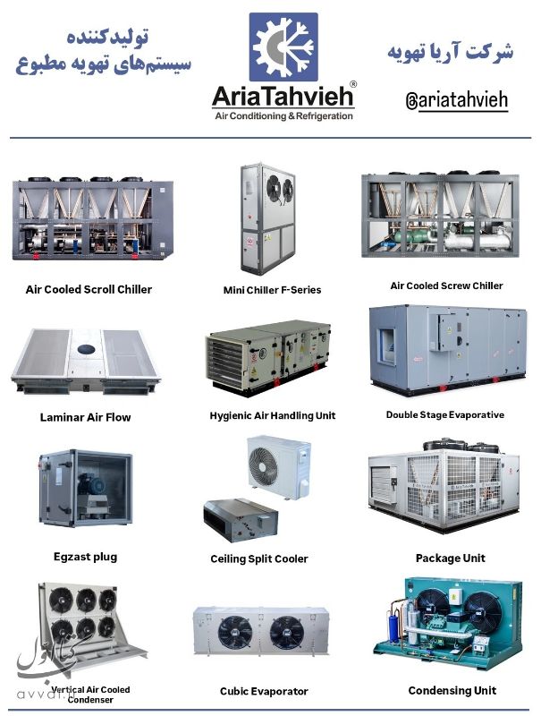 آریا تهویه تولید کننده انواع سیستم های تهویه مطبوع (چیلر، کندانسینگ یوینت، هواساز، روفتاپ پکیج، فن کویل و...) ،